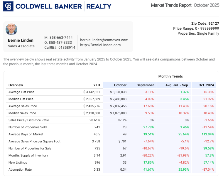 There are currently 60 homes for sale (posted 11/6/25) in ZIP 92127 ranging in price from $999,999 to $10,999,000 at an average of $3.231M and $746/SF.
