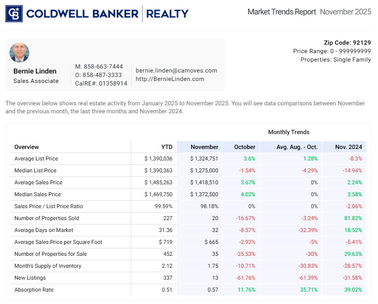 Rancho Penasquitos Single Family Homes Sold for November 2025: