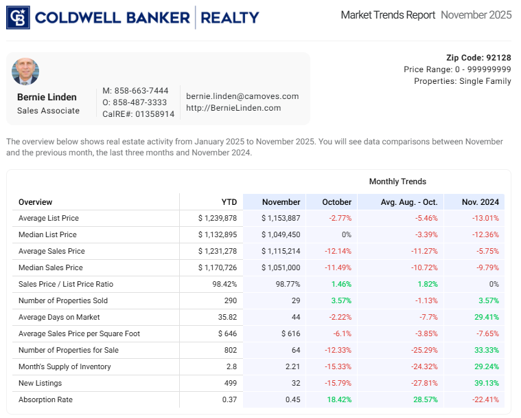 Currently in Rancho Bernardo there are 52 Active Homes for Sale (post date 12/10/25) ranging in price from $729,900 to $2,799,999. If you’d like more information on these homes or would like to better understand how working with a buyer’s agent has changed, I welcome the opportunity to be your real estate resource.