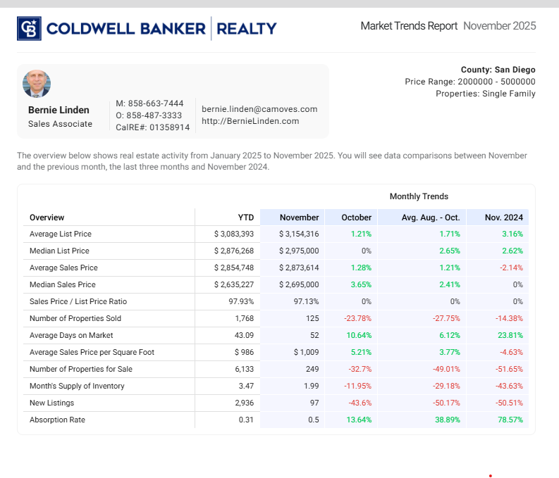 The luxury real estate market in San Diego County continues to show its resilience, nuance, and unmistakable appeal heading into the end of 2025. Whether you’re actively searching for a high‑end property or simply keeping an eye on market performance, understanding the latest data in this $2M–$5M segment is essential for making strategic decisions.